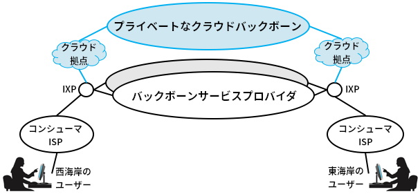 広く分散するクラウドが意味することが二つある。まず、クライアントとサーバーを結ぶエンドツーエンドの路がインターネット全体を通る必要がなくなる可能性がある。ユーザーが望むコンテンツの複製が近くの IXP ── たいていは一度の AS ホップで到達できる場所 ── で見つかる可能性が高く、もしそうなら地球規模の旅をしないで済む。次に、主要なクラウドプロバイダは分散データセンターを相互接続するのにパブリックインターネットを使わない。例えば分散されたデータセンター間でコンテンツを同期した状態に保つのはよくある処理だが、これは通常プライベートのバックボーンを使って行われる。そのためクラウドプロバイダは他の組織との完全な相互運用を考えることなく好きな最適化を利用できる。