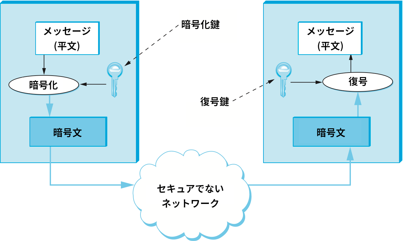 まず言葉を定義する。暗号化 (encryption) とは、メッセージに変換を施し、秘密にされた逆変換の方法を知らないと第三者が解読できないようにする処理を言う。送信者は相手に伝えたい平文 (plaintext) に暗号化を行う関数を適用し、得られた暗号文 (ciphertext) をネットワーク越しに転送する。メッセージの受信者は復号 (decryption) を行う秘密の関数 ── 暗号化関数の逆関数 ── を適用して平文を復元する。ネットワークを通じて送信される暗号文を第三者が盗聴できたとしても、受信者以外は復号関数を知らないので平文を得ることはできない。暗号化関数と復号関数によって表される変形を暗号 (cipher) と呼ぶ。暗号を使ってメッセージを送信する様子を図 195 に示す。