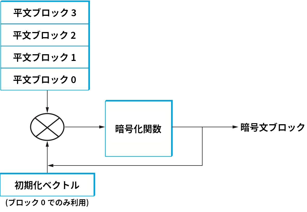 この問題を避けるために、ブロック暗号は各ブロックに対する暗号文が文脈に依存するように設計される。何を文脈とみなし、どのように文脈を利用するかを暗号の利用モード (mode of operation) と呼ぶ。よく使われる利用モードに CBC モード (cipher-block chaining mode, 暗号ブロック連鎖モード) がある。CBC モードにおいて、平文のブロックは一つ前のブロックの暗号文との XOR が取られてから暗号化される。こうすると各ブロックの暗号文は一つ前のブロックの暗号文に依存することになる (つまり、CBC モードでは直前のブロックの暗号文が文脈となる)。最初の平文ブロックは一つ前のブロックを持たないので、初期化ベクトル (initialization vector) と呼ばれる乱数との XOR が取られる。初期化ベクトルは復号処理でも使われるので、送信される暗号文ブロックの列に加えられる。CBC モードの模式図を図 196 に示す。CBC モードと異なるモードにカウンターモード (counter mode, CTR モード) がある。CTR モードではカウンターから得られる連続する値 (1, 2, 3, ...) を平文ブロックの暗号化で利用する。