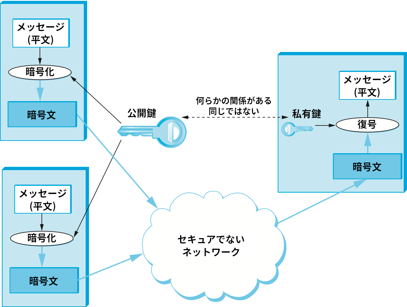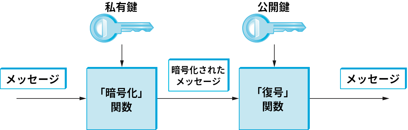 秘密鍵暗号と異なる暗号の分類として公開鍵暗号 (public-key cipher) がある。秘密鍵暗号では両参加者が単一の鍵を共有するのに対して、公開鍵暗号ではそれぞれの参加者が鍵の組を独立に持つ。鍵の組には特定の関係があり、一つは暗号化に、もう一つは復号に利用される。鍵の所持者は復号鍵を秘密にすることで、自身だけが暗号を復号できるようにする。一方で暗号化鍵は公開し、誰でもメッセージを暗号化して自身に送れるようにする。このため復号鍵は私有鍵 (private key) と呼ばれ、暗号化鍵は公開鍵 (public key) と呼ばれる。明らかに、この手法は公開鍵から私有鍵を推測できないことを前提としている。また、公開鍵暗号を使うときは公開鍵を使って暗号化したメッセージの送信を誰でも行えることも分かる: そのメッセージを復号できるのは復号に必要な私有鍵を持つ主体だけとなる。図 197 に公開鍵暗号の模式図を示す。