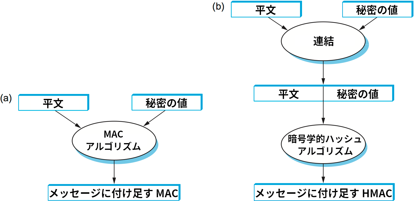 認証子の異なる生成方法として、ダイジェストを暗号化するのではなく、送信者と受信者だけが知っている秘密の値をダイジェストとは別に入力として受け取るハッシュ風の関数を使う方法がある。この様子を 図 199 (a) に示す。こういった関数によって生成される認証子を MAC (message authentication code, メッセージ認証符号) と呼ぶ。送信者は平文に MAC を付け足して送信し、受信者は秘密の値と受け取った平文から計算した MAC が受け取った MAC と一致するかどうかを確認する。
