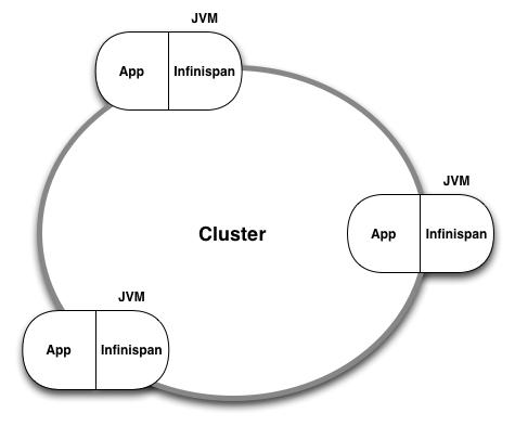 両方の利用法において、Infinispan インスタンスはネットワーク内の他の Infinispan インスタンスを検出し、クラスターを形成し、データの共有を開始し、クラスターに含まれる全てのサーバーを透過的に被覆するインメモリデータ構造をアプリケーションに提供する。クラスターにノードを追加して全体のキャパシティを増やしていくとき、Infinispan がアプリケーションに提供できるインメモリストレージの容量に理論上の制限はない。