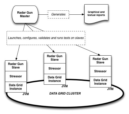 しばらくして Radar Gun は分散データ構造をベンチマークできるように拡張された。メインのターゲットは組み込みライブラリで変わらないものの、複数のフレームワークインスタンスを異なるサーバーで起動し、それぞれのインスタンスで分散キャッシングライブラリを起動することが Radar Gun から可能になった。その後はクラスターの各ノードでベンチマークが並列に実行される。ベンチマークが終了するとマスターの Radar Gun が結果を収集し、レポートを作成する。クラスターのサイズ (数ノードから数百・数千ノードまで) を手動で調整しながらベンチマークを実行するのは事実上不可能なので、ノードの自動的な追加と削除はスケーラビリティをテストする上で非常に重要となる。