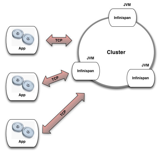 次に、Infinispan はリモートデータグリッドとしても利用できる。このとき、起動された複数の Infinispan のインスタンスがクラスターを形成し、クライアントは (様々なクライアントライブラリの一つを利用して) ソケット越しにクラスターへ接続する。この方式では Infinispan ノードのそれぞれが個別に隔離された JVM の中に存在し、JVM ヒープ全体を自身だけで利用する。