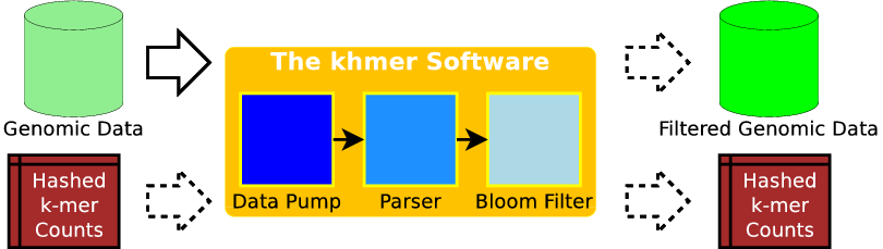khmer は数テラバイトにおよぶ可能性のある途方もない量のデータをディスクから物理 RAM に移動させる必要がある。ディスクと物理 RAM 間のスループットは物理 RAM と CPU 間のスループットより格段に (典型的には三桁、場合によっては四桁) 遅いので、効率的なデータポンプが不可欠となる。また、一部のフォーマットでは圧縮の解凍が必要になる。いずれのケースでも、パーサーは最終的なデータを効率的に扱わなければならない。パースは可変長の行を読む処理を基本とするものの、失敗したリードを考慮しなければならず、さらに配列フラグメントの先頭と末尾の組といった特定の生物学的情報を以降のアセンブリが活用できるように保存する必要もある。そこで、リードからは k-mer の集合が抽出され、それぞれの k-mer をキーとする Bloom filter が構築される。このとき以前に保存された Bloom filter を利用するなら、それをストレージから読み込まなくてはならない。また、Bloom filter の更新や保存ではストレージへの書き込みが必要になる。