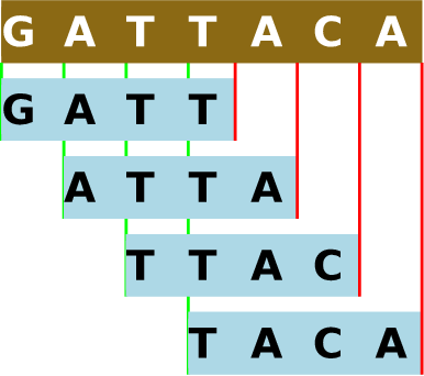 khmer[2] は従来のバイオインフォマティクスツールを使った解析に先立って大規模なゲノム配列データに対する前処理を行う、私たちが開発したソフトウェアツールの集合体を指す名前である ── 同名の東南アジアの民族とは関係ない。khmer という名前は k-mer という用語から来ている: 前処理の一部として、特定の長さ k の部分文字列全体の集合がゲノム配列から抽出される (図 12.1)。長い分子鎖はポリマー (polymer) と呼ばれるので、分子が特定の個数だけ連結した分子鎖 (そして前処理が生成する部分文字列) は k-mer と呼ばれる。リードに含まれる k-mer の個数は「ヌクレオチド鎖の個数 - k + 1」であり、ほぼ全てのリードが多くの重複する k-mer に分割される。