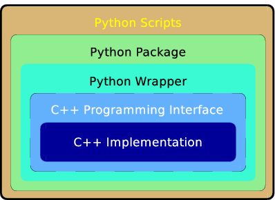 khmer のコアは C++ で書かれている。このコアは、データポンプ (オンラインストレージから物理 RAM へのデータ移動を担うコンポーネント)、よく使われるいくつかのフォーマットに対応したリードパーサー、そして複数の k-mer 数え上げ実装からなる。この上には、コアにアクセスするためのアプリケーションプログラミングインターフェース (application programming interface, API) が用意される。この API は当然 C++ プログラムから利用できる (khmer のテストドライバが利用している) のに加えて、khmer の Python ラッパーの基礎にもなる。Python ラッパーの上には Python パッケージがあり、このパッケージを使って書かれた Python スクリプトは数多く公開されている。まとめると、khmer は高速化のために C++ で書かれたコアコンポーネントと、操作の利便性のために Python で公開される高レベルインターフェース、そして様々なツールスクリプトの集合体であり、バイオインフォマティクスにおける多様なタスクを簡単に実行する手段を提供する (図 12.2)。