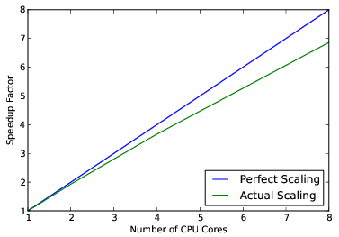 khmer をスケーラブルにするために注がれた労力にはそれだけの価値があったのだろうか? 価値はあったと私たちは考えている。完璧に線形な高速化が達成できたわけでは当然ないものの、現在の khmer ではコア数を 2 倍にすると速度が約 1.9 倍になる: