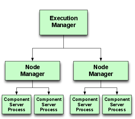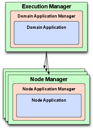 - この役割はグローバル層では ExecutionManager と呼ばれ、ローカル層では NodeManager と呼ばれる。Manager は単一のコンテキスト内でデプロイに関わる全てのエンティティを管理するシングルトンデーモンを指す。Manager は全てのデプロイにおけるエントリーポイント、そして ApplicationManager の実装をインスタンス化するファクトリとして機能する。