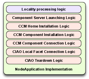 図 6.3 に示す DAnCE のアーキテクチャには、インスタンスのインストール・構成・接続に必要な全てのロジックが (図 6.4 のように) NodeApplication の実装に統合されるという問題があった: