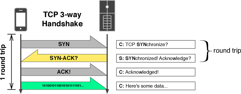 TCP のスリーウェイハンドシェイクでは、ロバストな両方向通信を可能にするためにクライアントとサーバーの間で動作パラメータが交渉される。最初の SYN (synchronize) メッセージはクライアントの接続リクエストを表す。この接続リクエストを受理するなら、サーバーは SYN-ACK (synchronize-acknowledge) メッセージを返答する。最後に、クライアントは ACK メッセージをサーバーに送り返す。この時点で論理的な接続が確立され、クライアントはデータの送信を開始できる。以上の説明を理解できていれば、スリーウェイハンドシェイクによって現在の RTT だけの遅延が発生することが分かるだろう。
