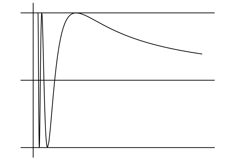 \(\sin\dfrac{1}{x}\) のグラフを描け。 [\(y = \sin(1/x)\) とすると任意の整数 \(m\) に対して \(x = 1/m\pi\) で \(y = 0\) となる。同様に \(x = 1/(2m + \frac{1}{2})\pi\) なら \(y = 1\)、\(x = 1/(2m - \frac{1}{2})\pi\) なら \(y = -1\) である。この曲線は全体が \(y = -1\) と \(y = 1\) の間に収まる (図 13)。グラフは上下に振動し、そのスピードは \(x\) が \(0\) に近づくにつれて速くなる。\(x = 0\) では関数が定義されない。また \(x\) が大きいとき \(y\) は小さくなる2。曲線の負の部分は正の部分と相似である]