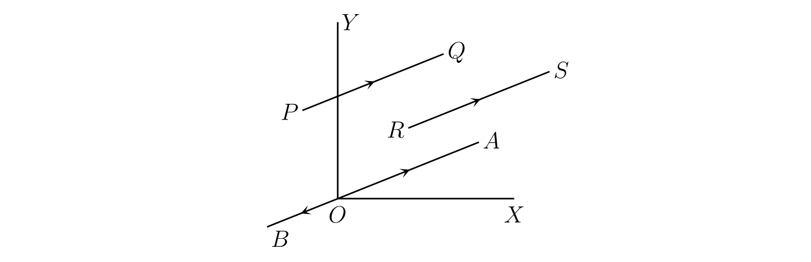 平面上に座標軸の組を (図 19 の \(OX,\ OY\) のように) 取る。\(PQ\) と同じ長さで平行な直線 \(OA\) を、\(O\) から \(A\) の向きが \(P\) から \(Q\) の向きと同じになるように取る。すると \(\overline{PQ}\) と \(\overline{OA}\) は同じ変位となる。\(x\) と \(y\) を \(A\) の座標とすると、\(\overline{OA}\) は \(x\) と \(y\) で曖昧さなく特定できる。\(\overline{OA}\) を変位 \(\bm{[x, y]}\) と呼び、次のように表記する: \[ \overline{OA} = \overline{PQ} = \overline{RS} = [x, y] \]