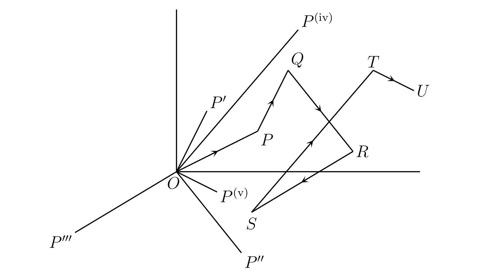証明は次の通り。\(\overline{OP},\ \overline{OP'},\ \ldots\ \) を複素数に対応する変位とする。\(PQ\) を \(OP'\) と平行で長さが等しいよう取り、\(QR\) を \(OP''\) と平行で長さが等しいように取る。以降も続けて取っていくと、最後の点 \(U\) では次が成り立つ: \[ \overline{OU} = \overline{OP} + \overline{OP'} + \overline{OP''} + \cdots \] \(OU\) の長さは考えている複素数の和の大きさと等しい。一方で複素数の大きさの和は折れ線 \(OPQR \ldots U\) の全長なので、\(OU\) より大きくはならない。
