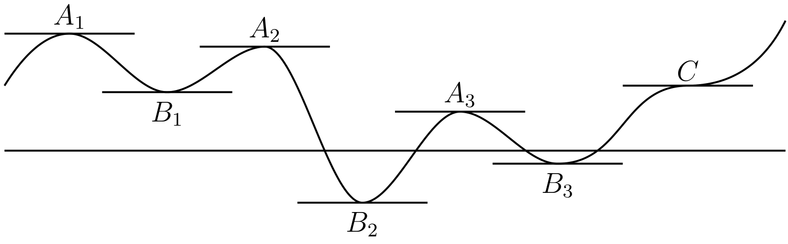 \(x = \xi\) における \(\phi(x)\) の値 \(\phi(\xi)\) が極大 (maximum) であるとは、\(x = \xi\) の近傍における任意の \(\phi(x)\) よりも \(\phi(\xi)\) の方が大きい、つまり \(\xi - \delta \lt x \lt \xi\) および \(\xi \lt x \lt \xi + \delta\) で \(\phi(\xi) \gt \phi(x)\) となる \(x\) の区間 \([\xi - \delta, \xi + \delta]\) が存在することを言う。同様に極小 (minimum) も定義する。例えば 図 39 ではグラフで表される関数が極大の点に \(A\) が対応し、極小の点に \(B\) が対応する。\(A_{3}\) が極大で \(B_{1}\) が極小の状況で \(B_{1}\) における関数の値が \(A_{3}\) における値よりも大きくなっているが、これは何も問題ないことに注意してほしい。