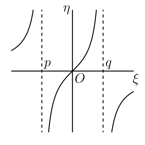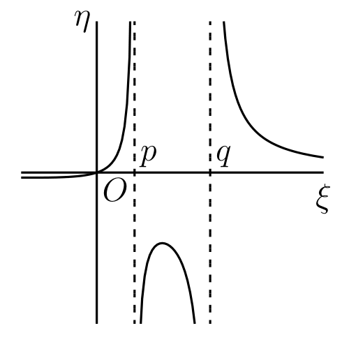 \(\xi\) に関する \(\eta\) の導関数は \[ (\xi - p)(\xi - q) - \xi(\xi - p) - \xi(\xi - q) = 0 \] つまり \(\xi^{2} = pq\) のとき \(0\) となる。よって \(\eta\) の導関数は \(p\) と \(q\) の符号が同じなら二つの根を持ち、異なるなら根を持たない。後者の場合の \(\eta\) のグラフを 図 41a に示す。