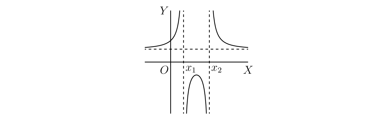 以上の議論は \(\lambda \neq 0\) を仮定している。\(\lambda = 0\) なら \(a/A = b/B\) であり、 \[ \begin{aligned} y - \frac{a}{A} & = \frac{\mu}{A(Ax^{2} + 2Bx + C)}\\ & = \frac{\mu}{A^{2}(x - x_{1})(x - x_{2})} \end{aligned} \] となる。\(dy/dx = 0\) とすると単一の値 \(x = \frac{1}{2}(x_{1} + x_{2})\) を得る。グラフを描けば、\(\mu\) が正ならこの値で極大となり、負なら極小となることが分かる。\(\mu\) が正の場合のグラフを 図 42 に示す。