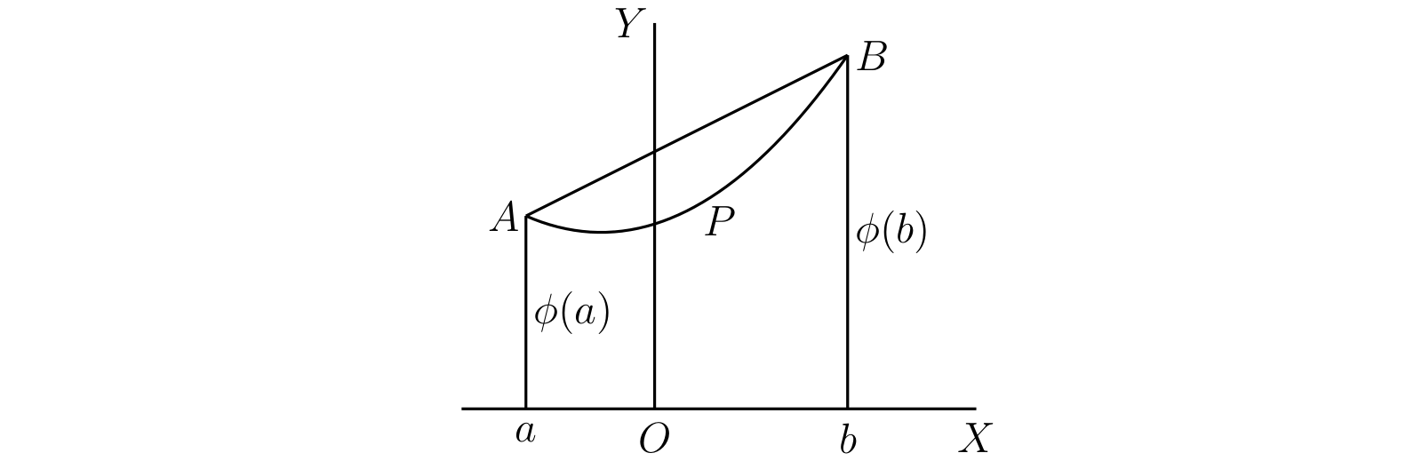 式 \[ \phi(b) - \phi(x) - \frac{b - x}{b - a}\{\phi(b) - \phi(a)\} \] が曲線上の点と弦上の点の \(y\) 座標の差を表すことを示せ。