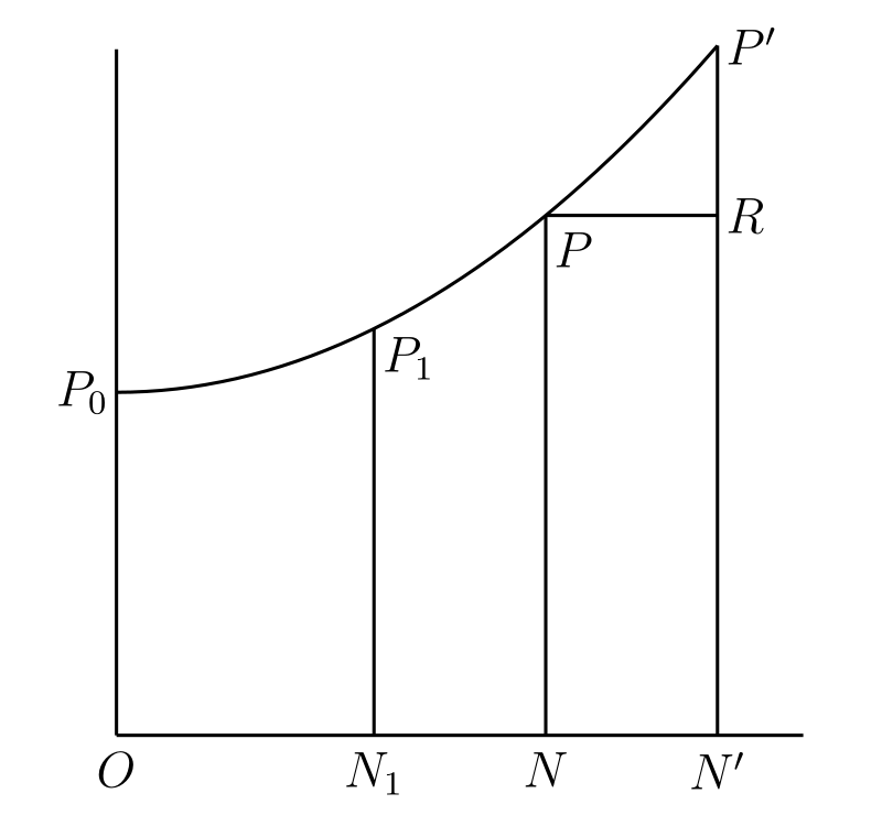 求める面積が \(N_{1}NPP_{1}\) なら、\(P_{1}\) の \(x\) 座標を \(x_{1}\) として \(\Phi(x_{1}) = 0\) が成り立つように定数を定める必要がある。あるいはもし曲線が \(x\) 軸の下方にあるなら \(\Phi(x)\) が負になるので、\(\Phi(x)\) の絶対値が面積となる。