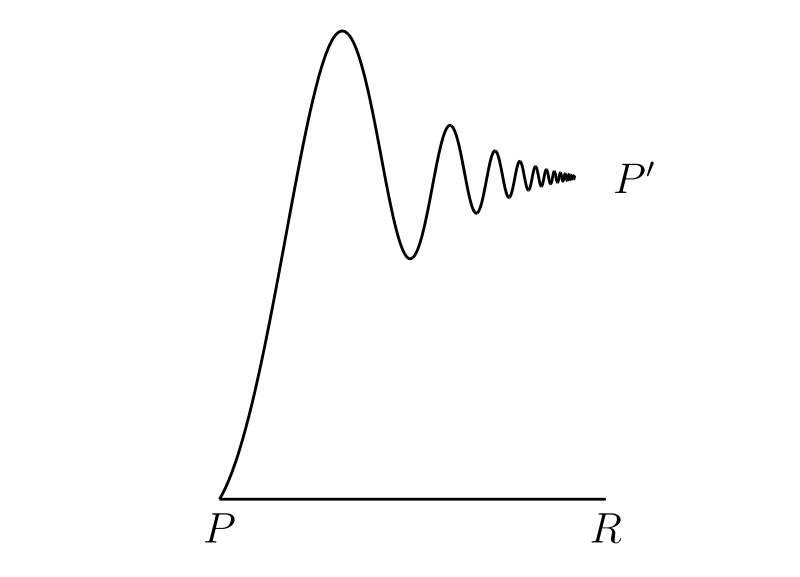 今考えている図では \(PRP'\) の面積は \(hk\) より小さいが、これは常に成り立つわけではない。弧 \(PP'\) が \(P\) から \(P'\) に向かうときに単調に増加あるいは減少するとは限らないためである (例えば 図 44a)。しかし \(\lambda(h)\) を \(PR\) から \(PP'\) 上の任意の点への距離の最大値とすれば、\(PRP'\) の面積は \(|h|\lambda(h)\) より小さくなる。また \(\phi(x)\) は連続関数だから、\(h \to 0\) のとき \(\lambda(h) \to 0\) が成り立つ。よって \[ \Phi(x + h) - \Phi(x) = h\{\phi(x) + \mu(h)\} \] となる。ここで \(|\mu(h)| \lt \lambda(h)\) かつ \(h \to 0\) のとき \(\lambda(h) \to 0\) である。この式からも \(\Phi(x)\) が連続だと直ちに分かる。さらに \[ \Phi'(x) = \lim_{h \to 0} \frac{\Phi(x + h) - \Phi(x)}{h} = \lim_{h \to 0} \{\phi(x) + \mu(h)\} = \phi(x) \] だから、曲線の \(\bm{y}\) 座標は面積の導関数で、曲線の \(\bm{y}\) 座標の積分は面積となる。