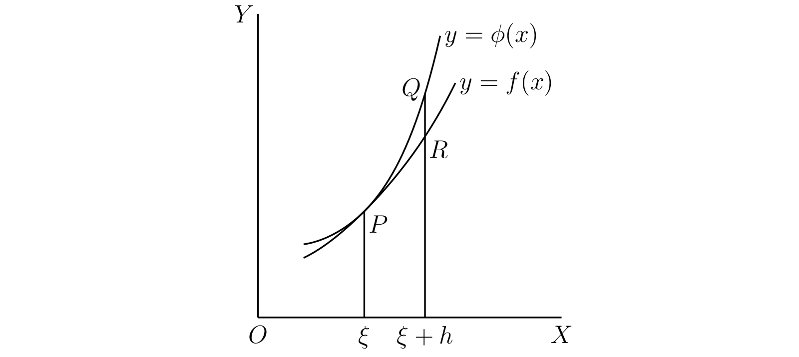 曲線が接触する点は異なる視点からも観察できる。上図では二つの曲線が \(P\) で接しており、\(QR\) が \(\phi(\xi + h) - f(\xi + h)\) に等しい。\(\phi(\xi) = f(\xi)\) および \(\phi'(\xi) = f'(\xi)\) だから、\(QR\) は \[ \dfrac{1}{2} h^{2}\{\phi''(\xi + \theta h) - f''(\xi + \theta h)\} \] にも等しい。ここで \(\theta\) は \(0\) から \(1\) の間の実数を表す。ここから \(h \to 0\) で \[ \lim \frac{QR}{h^{2}} = \dfrac{1}{2}\{\phi''(\xi) - f''(\xi)\} \] だと分かる。言い換えると、\(x\) 座標が \(\xi\) の点で二つの曲線が接するなら、\(\bm{x}\) 座標が \(\bm{\xi + h}\) の点における曲線の \(\bm{y}\) 座標の差は \(\bm{h}\) が小さいとき二次の小ささを持つ。