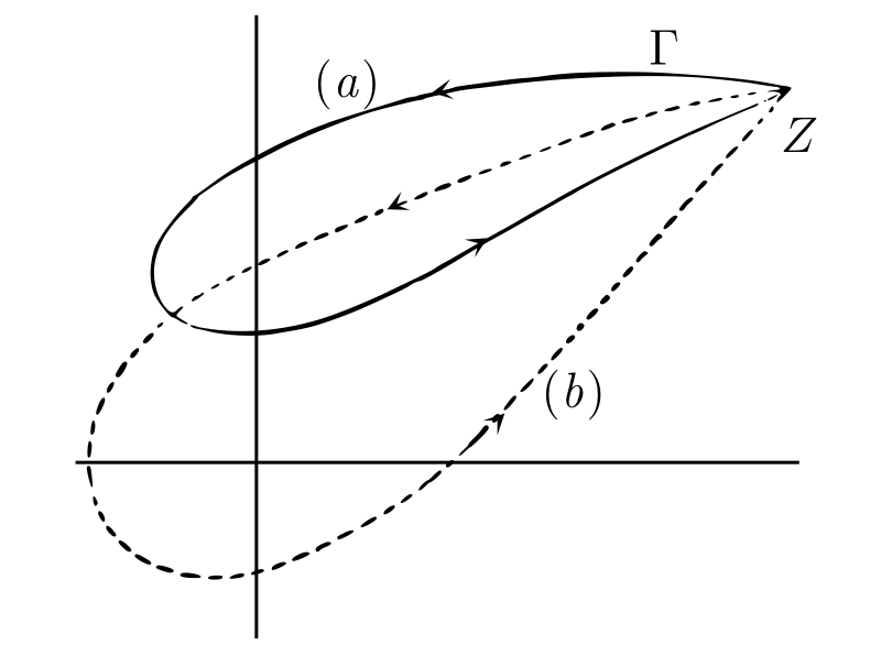 任意の \(Z\) は無限個の \(\arg Z\) を持ち、それらは \(2\pi\) の倍数だけ離れている。さらに \(Z\) が \(\Gamma\) 上を動くとき、全ての \(\arg Z\) は連続的に変化する1。よって最初の \(Z\) に対応する偏角を一つ選び、\(Z\) が \(\Gamma\) に沿って動くときに連続的に変化する偏角の値を追うことで、\(\Gamma\) 上の全ての点に対する特定の \(\arg Z\) を選択できる。ここからの議論では "\(Z\) の偏角" という言葉および記号 \(\arg Z\) をこうして選択した \(Z\) の偏角に対して使うことにする。つまり \(\arg Z\) は \(Z\) の実部 \(X\) と虚部 \(Y\) の連続な一価関数を表す。