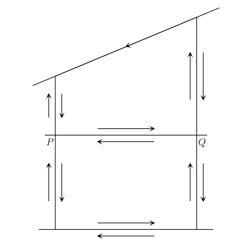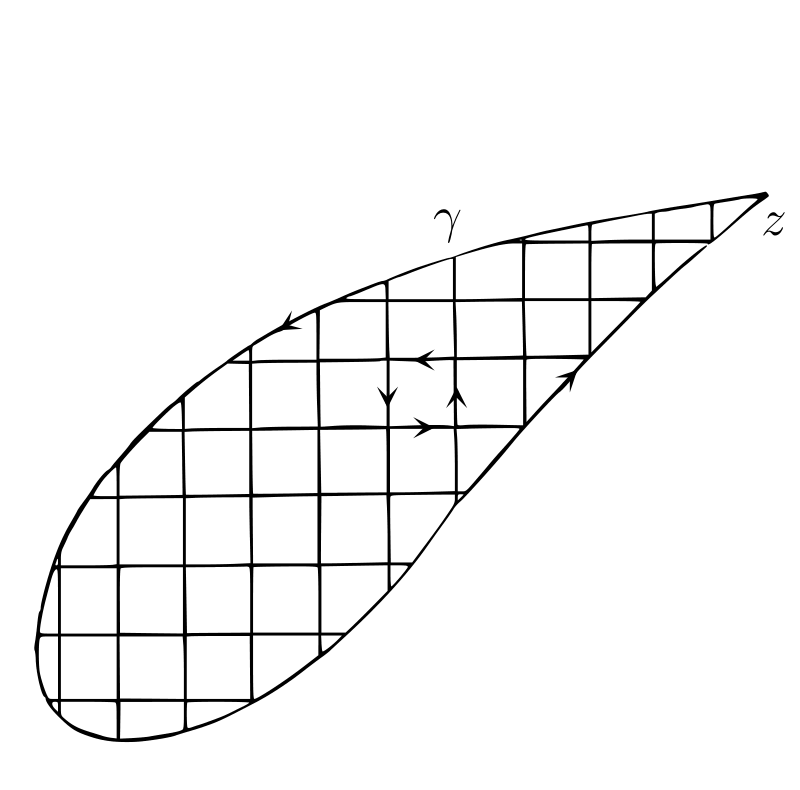 図 C のように、軸に平行で \(\delta_{1}\) だけ離れた直線を使って \(\gamma\) をたくさんの小さな閉曲線に分割する2。もしこれらの小閉曲線上で \(Z = 0\) となるなら証明したい条件が成り立つので、そうならないと仮定する。このとき \(z\) が \(\gamma\) をたどるときの \(\arg Z\) の増分は、\(z\) が全ての小閉曲線を別々にたどるときの増分の和に等しい。証明は次の通り。\(z\) が全ての小閉曲線を同じ方向にたどるとき、最終的に \(z\) は閉曲線 \(\gamma\) を一度だけたどり、その他の軸に平行な直線は逆方向に一度ずつたどる。つまり \(z\) は図中の \(PQ\) を \(P\) から \(Q\) へ一度、\(Q\) から \(P\) へ一度通過する。\(z\) が \(P\) から \(Q\) へ動くとき、仮定より \(Z\) は原点を通らないので、\(\arg Z\) は連続的に変化する。このときの \(\arg Z\) の増分を \(\theta\) とすれば、\(z\) が \(Q\) から \(P\) へ動くときの増分は \(-\theta\) となる。よって \(\arg Z\) の増分を全て足せば、小閉曲線からの寄与は全て打ち消され、\(\gamma\) からの寄与だけが残る。
