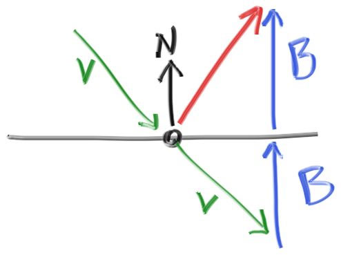 滑らかな金属では、レイがランダムに散乱することはない。さて数学の時間だ: レイは金属鏡面でどのように反射するだろうか? ここではベクトルが私たちの友達になる: