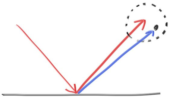 鏡面反射したレイの端点を中心とする小さな球を考えれば、反射レイの方向をランダムに変化させることができる: