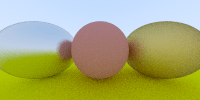 球が大きければそれだけ反射は大きくぼやける。この球の半径を「ぼやけ (fuzziness)」としてマテリアルのパラメータに追加するのが自然だろう (ぼやけが \(0\) なら反射は全くぶれない)。ただしここで、ぼやけが大きい表面にほぼ水平の角度で入射したレイが表面の下に散乱する可能性があることに注意が必要となる。こういったレイは表面に吸収されたとみなすことにする。