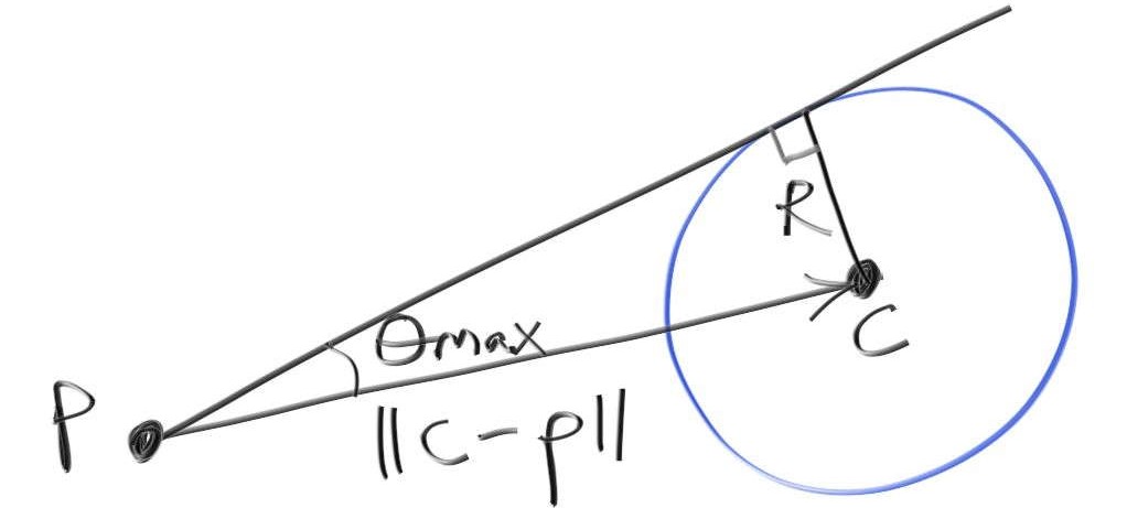 続いて \(\theta_{\text{max}}\) を考える。図から \(\sin \theta_{\text{max}} = R / \| \mathbf{c} - \mathbf{p} \|\) が分かるから、 \[ \cos \theta_{\text{max}} = \sqrt{1 - \frac{R^2}{\|\mathbf{c} - \mathbf{p}\|^{2}}} \] である。