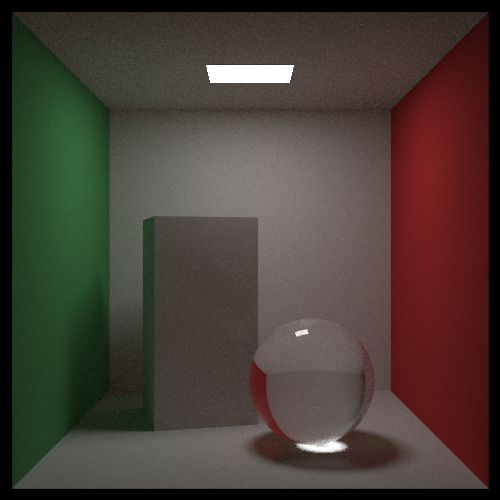 ノイズの多いコーネルボックスが得られるが、球の下の集光模様は上手くレンダリングされている。私の環境ではライトをサンプルするときの五倍の時間がかかった。ガラスに当たるレイは計算コストが高いということだろう。