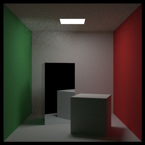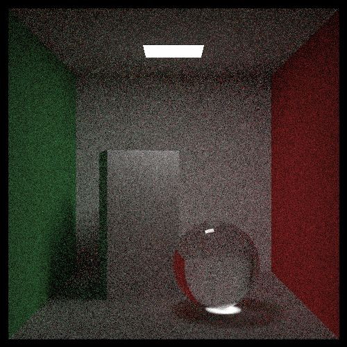 レンダリングされる画像では、直方体からの反射で照らされる部分 (画像左上) にノイズが多く残る。これは直方体を向くレイを多くサンプルしていないためである。