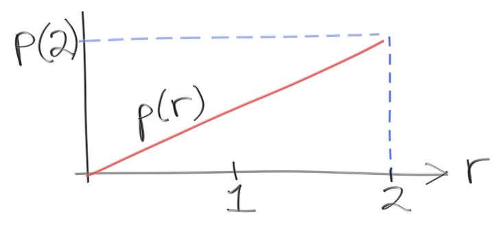 理解を深めるために、PDF を作って先ほどの積分で利用してみよう。\(0\) から \(2\) の値を取る乱数 \(r\) があって、\(r\) の値が \(x\) となる確率が \(x\) 自身に比例する状況を考える。このとき PDF \(p(r)\) は次の形となるはずだが、この高さはいくつだろうか?