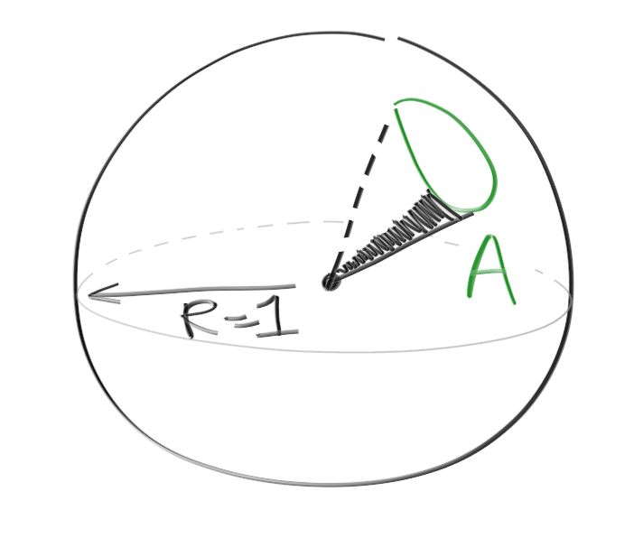 積分や確率が単位球上に渡るものである点が、ここで重要となる。"方向" は単位球上の面積として測られ、方向、立体角 (solid angle)、面積といった言葉で表される ──立体角と呼ばれることが最も多い。もしこの言葉を理解できるなら、素晴らしい! もしよく理解できないなら、私と同じように方向を指すベクトルの束が貫く単位球上の領域の面積を考えるとよい。立体角 \(\omega\) は単位球上に射影した領域の面積 \(A\) と等しい。
