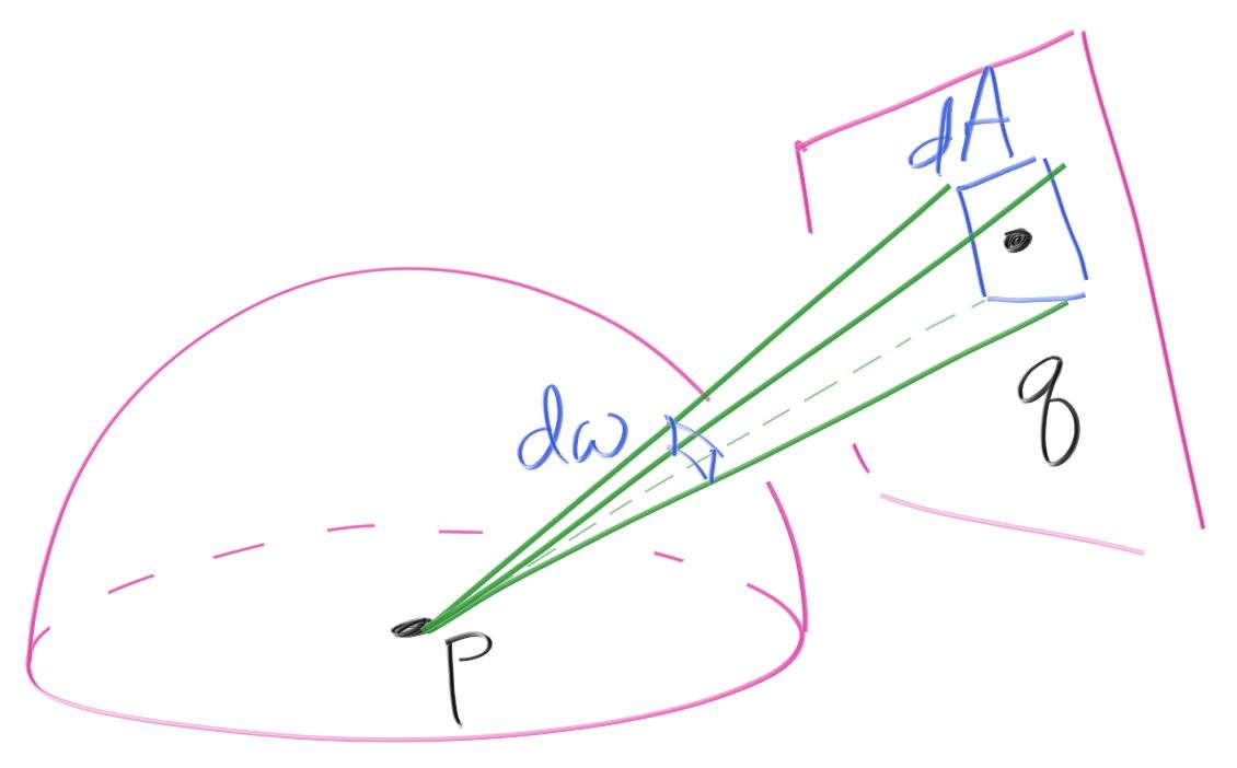 ライト上に小面積 \(dA\) を取り、その内部の点を適当に \(q\) とする。このとき一様ランダムに選択したライト上の点がこの小面積内にある確率は \(dA/A\) である。また求めようとしている PDF \(p(\text{direction})\) において単位球上の小面積 \(dw\) をサンプルする確率は \(p(\text{direction}) \cdot dw\) と表せる。さらに \(dw\) と \(dA\) の間には次の幾何学的な関係がある: \[ dw = \frac{dA \cdot \cos \alpha}{\text{distance}^2(p,q)} \] ここで \(\alpha\) は \(\text{direction}\) とライトの法線がなす角度を表す。\(dw\) と \(dA\) から点が選ばれる確率が同じだから \[ p(\text{direction}) \cdot dw = p(\text{direction}) \cdot \frac{dA \cdot \cos \alpha}{\text{distance}^2(p,q)} = \frac{dA}{A} \] つまり \[ p(\text{direction}) = \frac{\text{distance}^2(p,q)}{\cos \alpha \cdot A} \] が成り立つ。