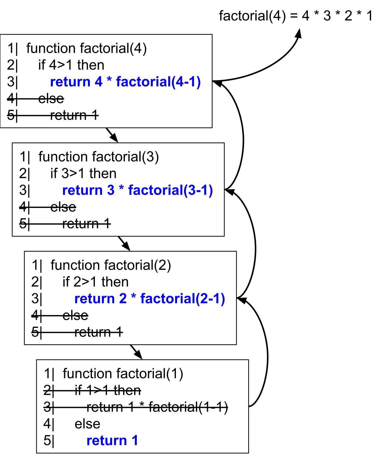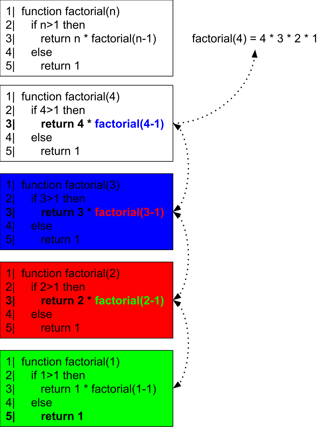 再帰的な関数では、ベースケースの解に到達するまで return 文で自分自身を呼び出し続ける。
