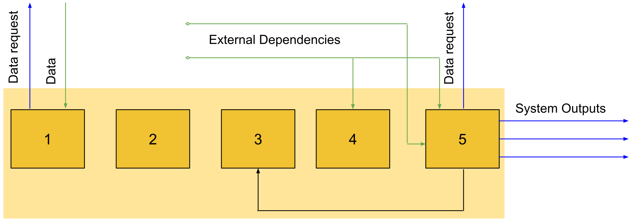長すぎる文を避けるのと同様に、視覚的に饒舌な図を避けてください。経験的な感覚として、一つの段落に収まらない量の情報を一つの図に収めるのを避けるべきです。また箇条書きで説明すると要素が五つよりも多く必要な図も経験的に望ましくありません。「でも現実の技術的なシステムは図 3 よりずっと複雑になるじゃないか」とあなたが言うのが聞こえます。あなたの意見は間違っていませんが、そのような現実世界の複雑なシステムを一つの段落で説明しなくてはと思うことはないはずです。