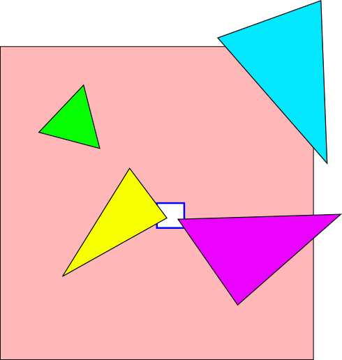 ほぼ中央にある白い四角形がビューポートを表し、それを囲む大きなピンク色の領域がガードバンドを表す。この画像だとビューポートがずいぶん小さく見えるが、実はこれでも見えなくならないように巨大なビューポートを選んでいる! 今考えているガードバンドクリッピングの範囲は -32768 ... 32767 なので、このビューポートは幅と高さが約 5500 ピクセルということになる──そうだ、ここにある三角形はどれも非常に大きい :) 話を進めると、図中の三角形には重要なケースが示されている。緑色の三角形は全体がガードバンドに収まっているが、ビューポート領域の外側にあるので、ガードバンドクリッピングまで到達しない──ビューポートカリングで破棄される。青い三角形はガードバンド領域からはみ出ておりクリップが必要だが、これもビューポート領域の完全に外側にあるのでビューポートカリングで破棄される。そして紫色の三角形はビューポート内部とガードバンド外部の両方にまたがるので、この三角形はクリップする必要がある。