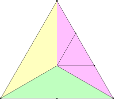 内部 TF はクアッドでは非常に簡単になる: 上のクアッドは u 方向の内部 TF が 3 で、v 方向の内部 TF が 4 である。基本的にテッセレート後のジオメトリはそのサイズの構造格子で、例外的に最初と最後の行/列では向き合う辺上の頂点の間を縫い結んだジオメトリとなる (いずれかの辺 TF が 1 だと、u と v の両方に関する内部 TF が 2 であるかのような構造が最終的なメッシュとなる)。三角形では少し複雑になる。これまでに示してきたのは内部 TF \(N\) が奇数の場合で、このとき三角形の内側に \((N+1)/2\) 個の三角形が生成され、一番内側の図形は単一の三角形となる。\(N\) が偶数のときは内部に \(N/2\) 個の三角形と中心に一つの点が生成される。\(N = 2\) の場合を次に示す。このときは辺上の頂点と中心の頂点を縫い合わせただけとなる: